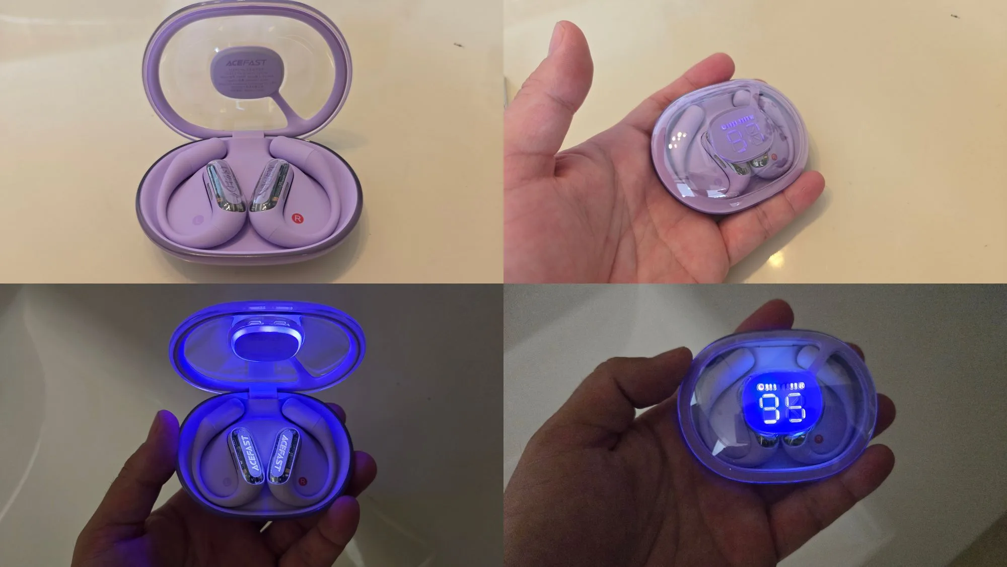 ケースも小さく、手のひらにすっぽりと収まるサイズ。ケース中央はLEDディスプレイとなっており、ケースバッテリー残量、L/Rイヤホンのバッテリー残が分かるようになっています。