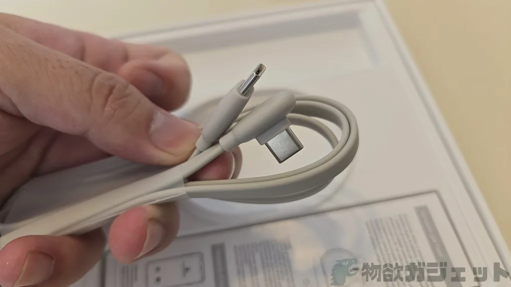 L字の理由はケースで、ケース下部にUSB Type-C端子があるため。でもこのフラットケーブルにより充電の際も置いて安定します。