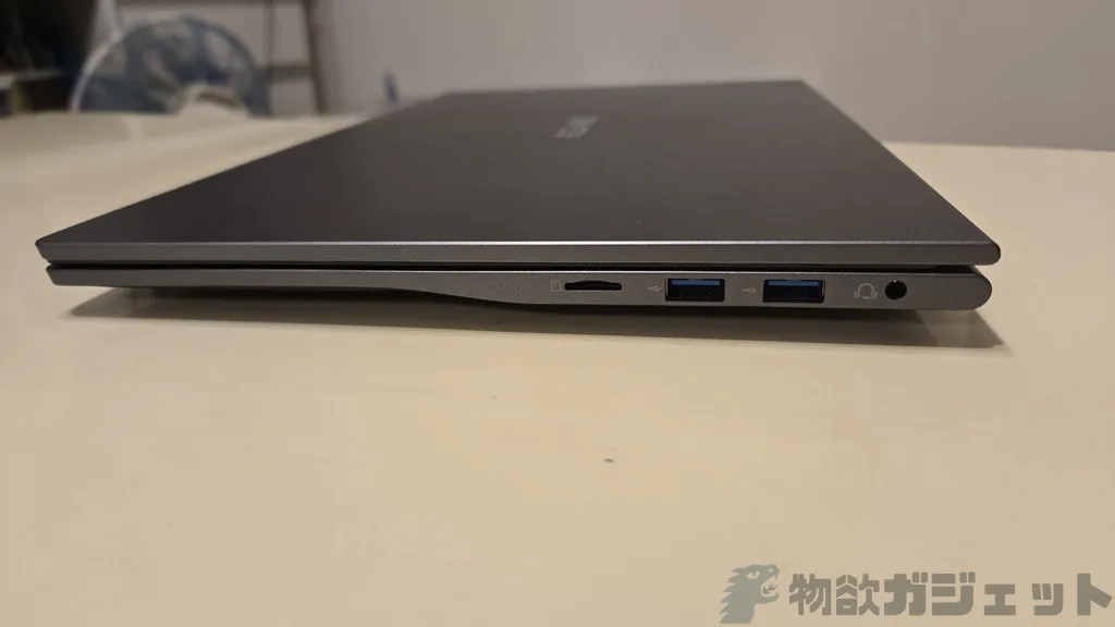 右側側面には、microSDカード、USB Type-A 3.2が2ポート、イヤホンジャック。ちゃんとUSB分の幅をデザインでうまく処理しているのは好感持てます。