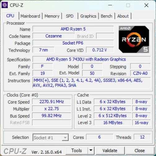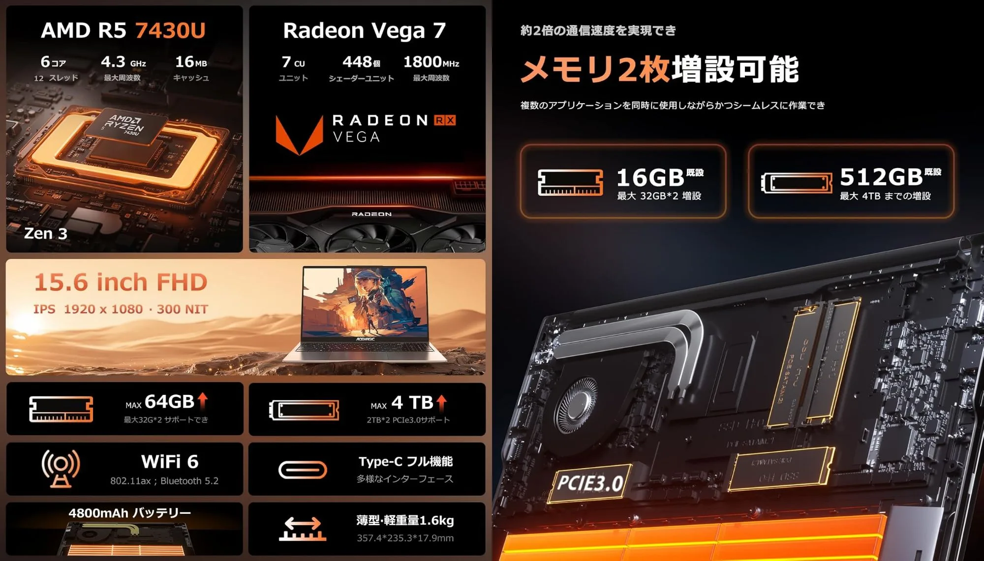 CPUには6コア12スレッドのAMD Ryzen 5 7430U、メモリ16GB、512GBの高速SSDを搭載。