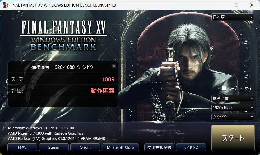 一応ゲームのベンチマークもと思い、FF15ベンチをためしてみましたが、結果は”動作困難”でした。さすがにこまレベルのゲームは厳しい。