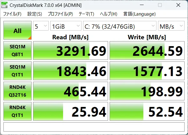 512TB PCIe NVMe SSDを搭載しているのですが、結果は以下の通り。