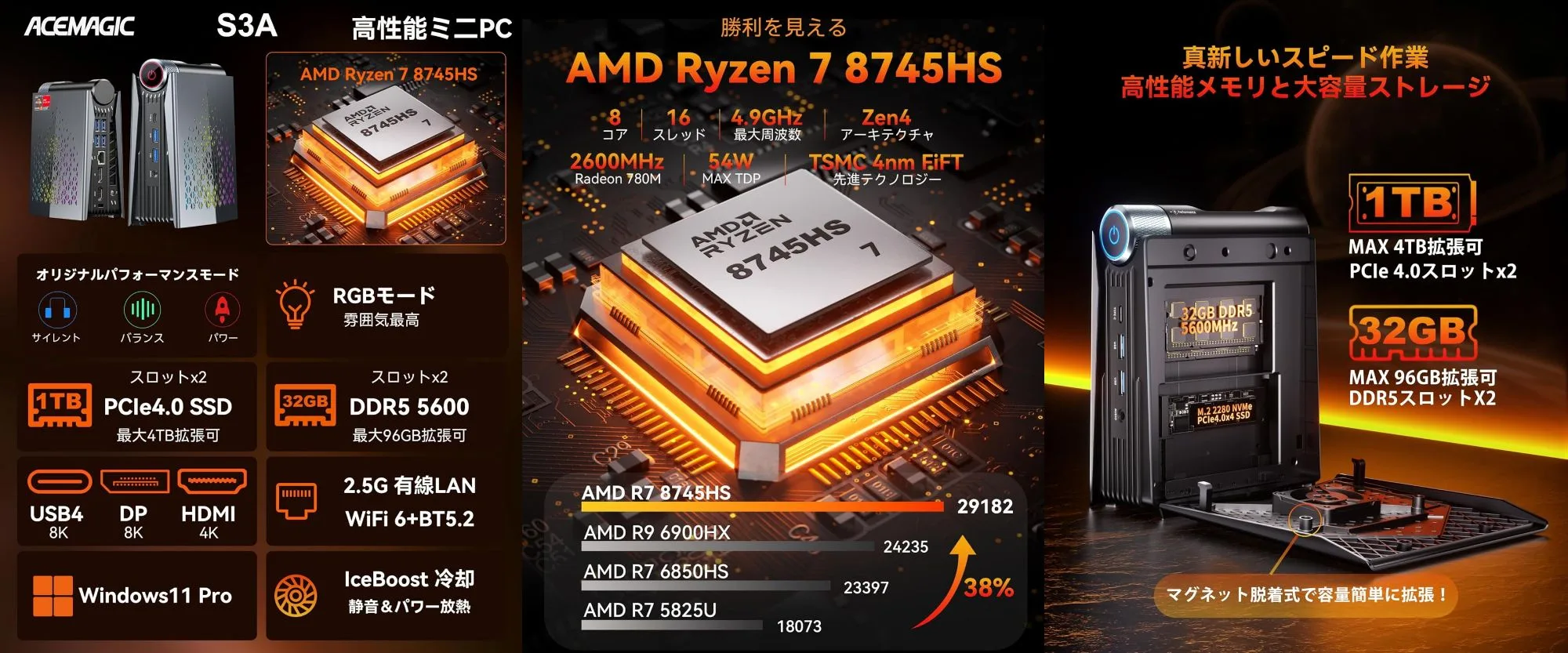 ACEMAGIC S3Aは、RGB LEDライトが映える独創的なデザインと実用的なスペックを両立したミニPCです。