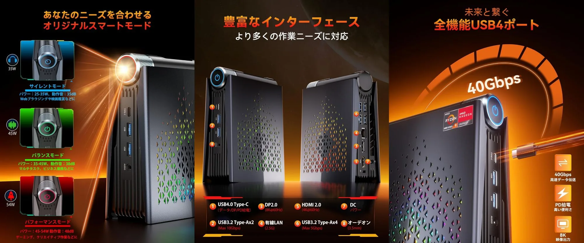 USB4を含む3系統の映像出力や、ダイヤル一つで静音・性能重視を切り替えられる物理スイッチも非常に実用的。重量級ゲームは苦手ですが、ドラクエX程度の軽快なゲームや動画編集、マルチタスクを快適にこなせます。所有欲を満たすデザインと、メイン機として通用する高い処理能力を両立した、コンパクトなデスクトップPCが欲しければオススメな製品です。