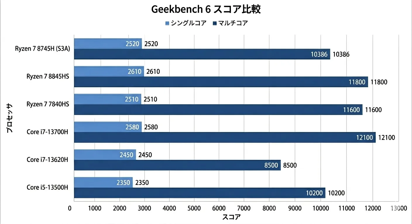 Ryzen 7 8745HSを搭載し、シングル性能はCore i7-13700Hに匹敵するパワーを誇ります。