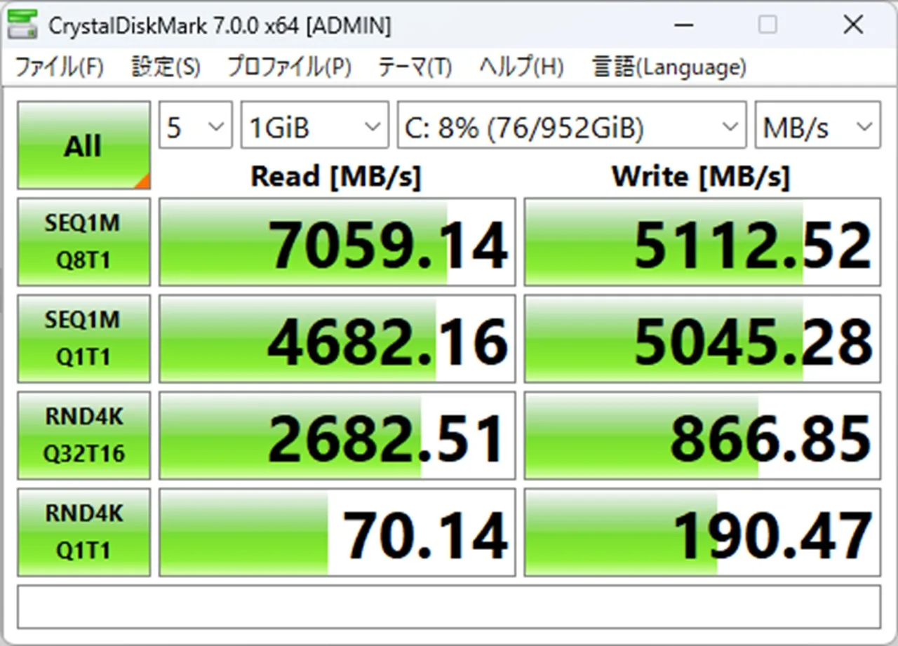 1TB PCIe SATA SSDを搭載しているのですが、結果は以下の通り。