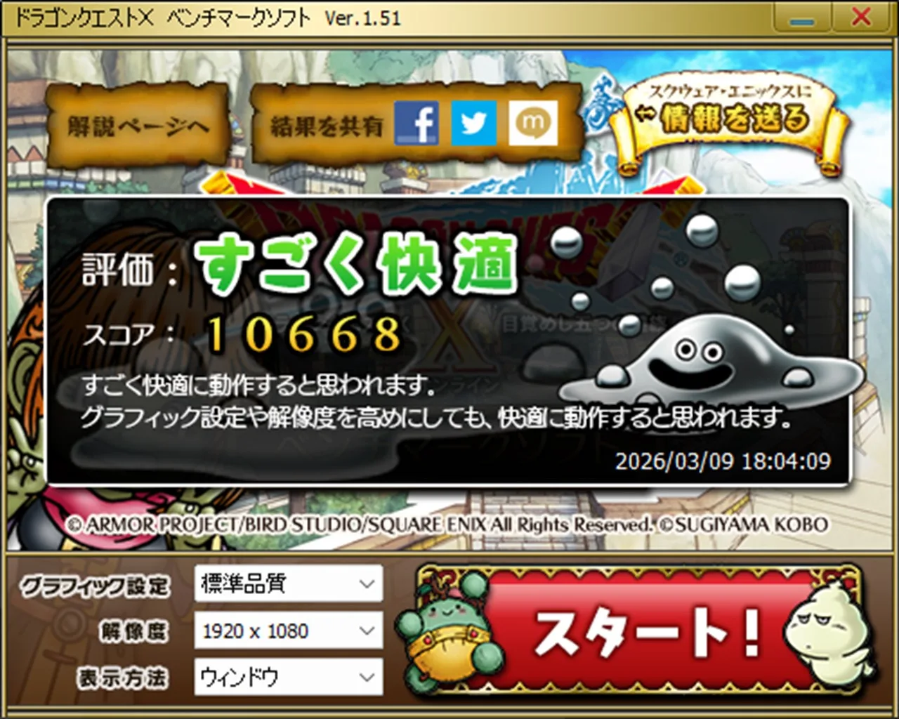 続いてドラゴンクエストX ベンチマークでは、すごく快適となりました。だいたい70-80fpsは出ているので、ドラクエXは余裕。