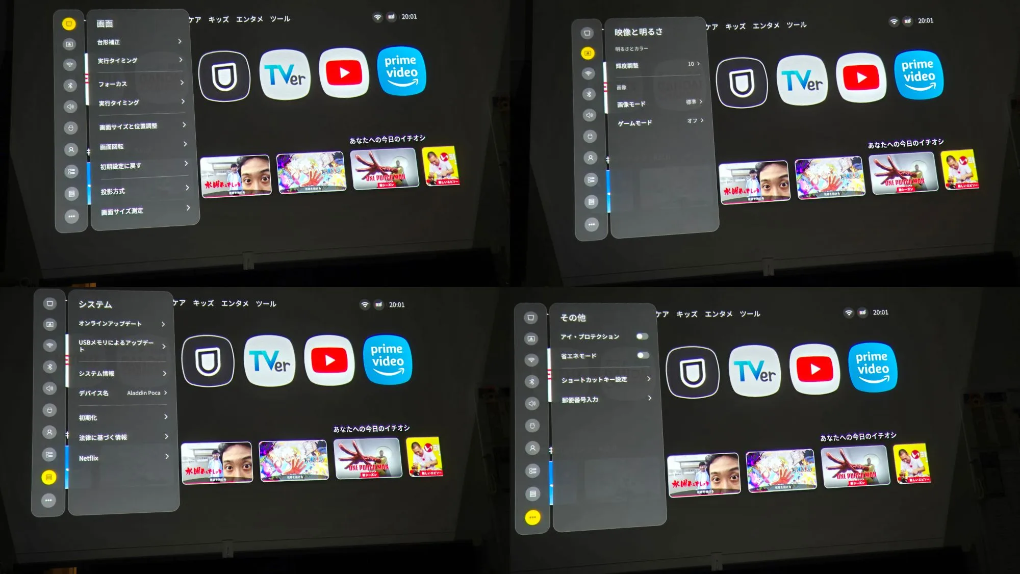 台形補正は4辺を細かく調整できますし、フォーカス、ズームやサウンド関連、スピーカーライトの設定なども変更可能。