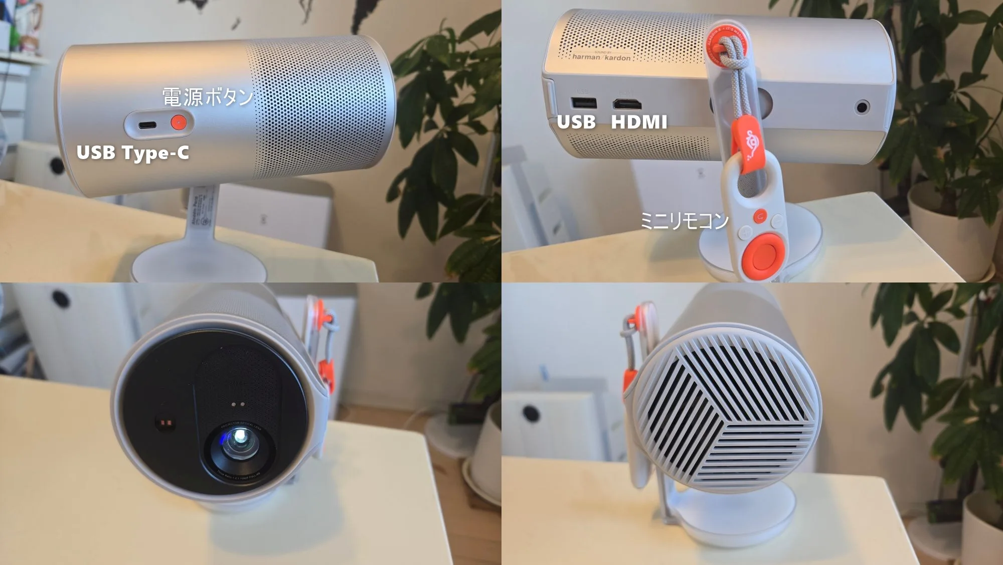 Aladdin Pocaは、約1.3kgの軽量コンパクトなボディのプロジェクターで、高音質なHarman Kardon製スピーカー、バッテリー駆動、独自のAladdin OSをすべて詰め込んだオールインワン設計。
