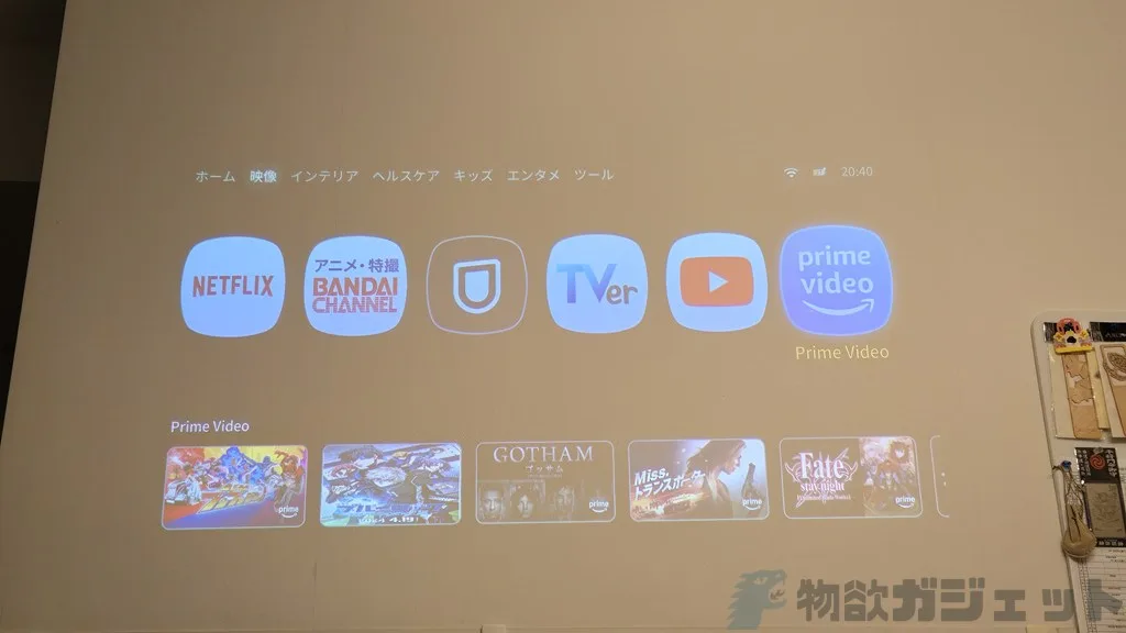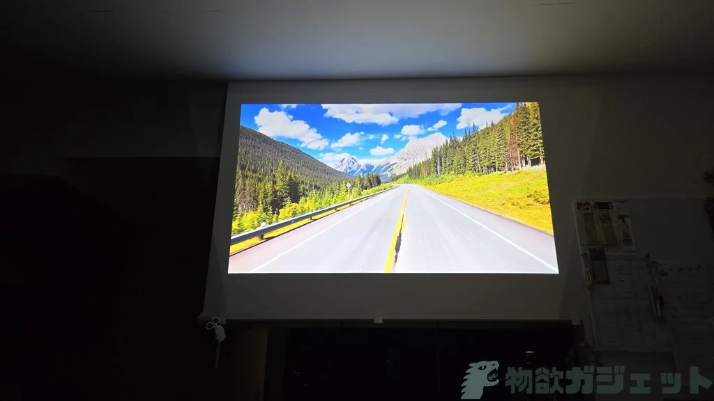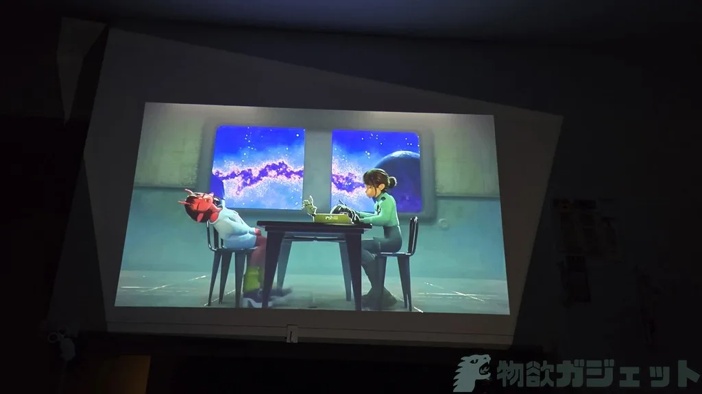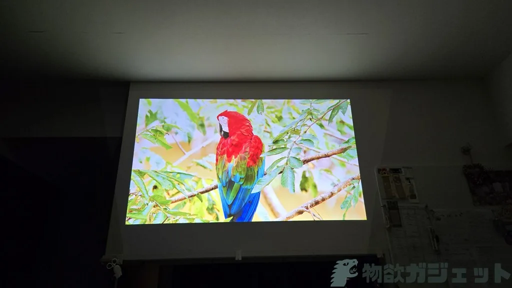 映像はこのようにプロジェクタースクリーンではない”ただの壁”に投影しても、くっきりはっきりとした十分な美しさがあります。