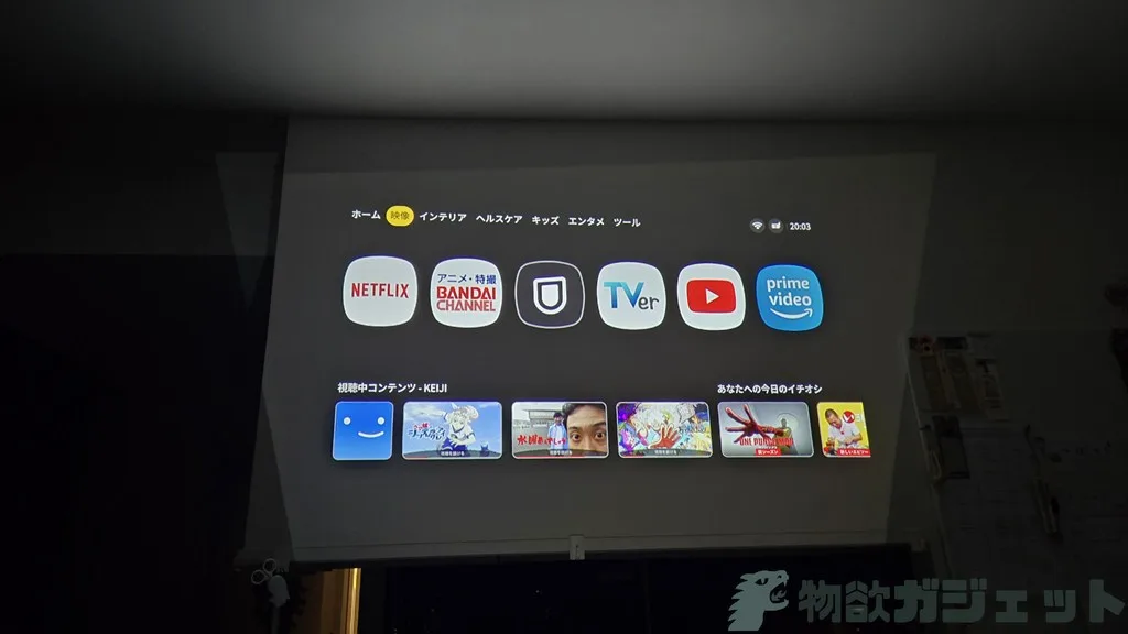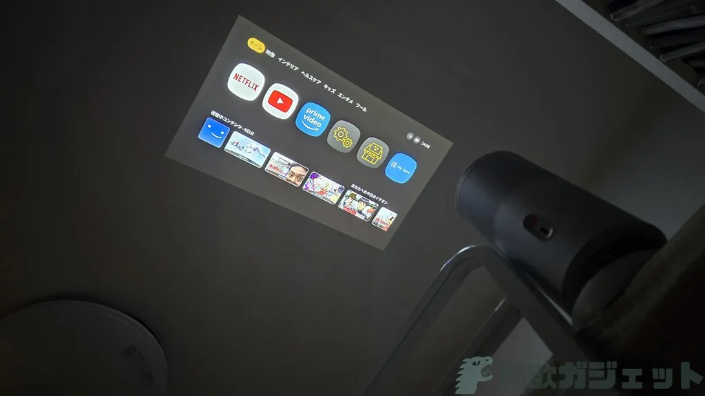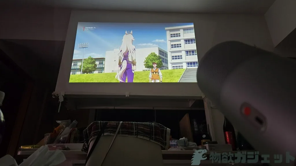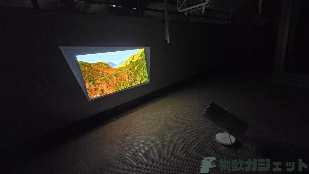 そのオートフォーカスも自動台形補正もとても速く、キビキビと動いてくれますので、「どこに置こうかな」と迷っている時にテストで置いて、「あ、こっちでやるか」と少し動かしてもどんどん台形補正と画角調整をしてくれるので、気持ちよく使う事ができます。(これが遅いと待たされるのでイライラする)