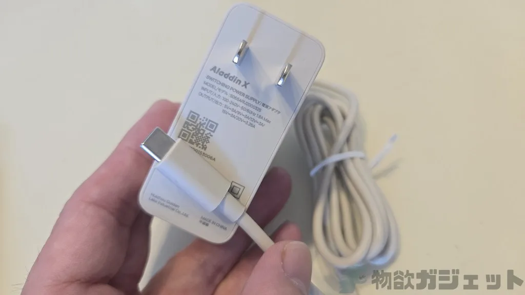 ACアダプタは65W USB Type-C端子のタイプ。前述のように65W USB PD出力ができれば、このACアダプタではなくとも動作します。そのため、65W出力以上のモバイルバッテリーでも可能というのはとても大きなメリットです。