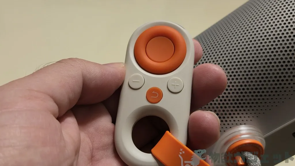 一つは本体に紐で繋がっている赤外線リモコン。Aladdin Pocaは”どこでも使える”という大きなメリットがありますが、リモコンを忘れると操作ができません。しかし、このように赤外線リモコンが本体にくっついている為、「あ、リモコン忘れた」という事からは解放されます。なにげに素晴らしい事ですよこれは。