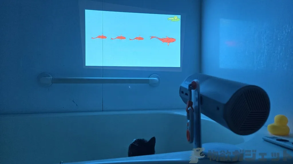 そのため、このAladdin Pocaをお風呂場に持ってきて映すと、いい感じで勝手に遊んでくれます。ここなら傷つきませんしね。