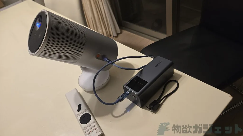コードレスだからベランダの壁にだって投影可能。こんな感じの使い方ができるので、当然キャンプなんて最高ですね。