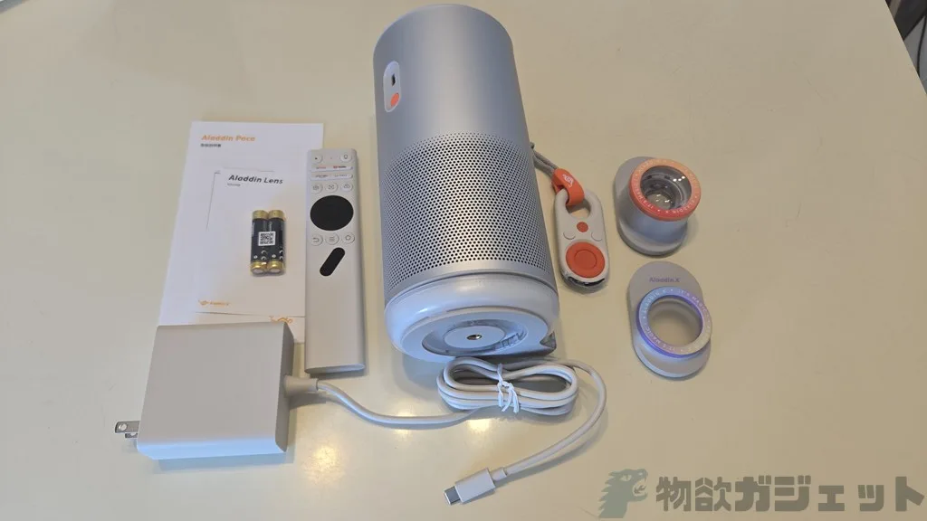 同梱物はAladdin Poca本体、ACアダプタ、リモコン、電池、Aladdin Lens 2個、マニュアルとなっています。