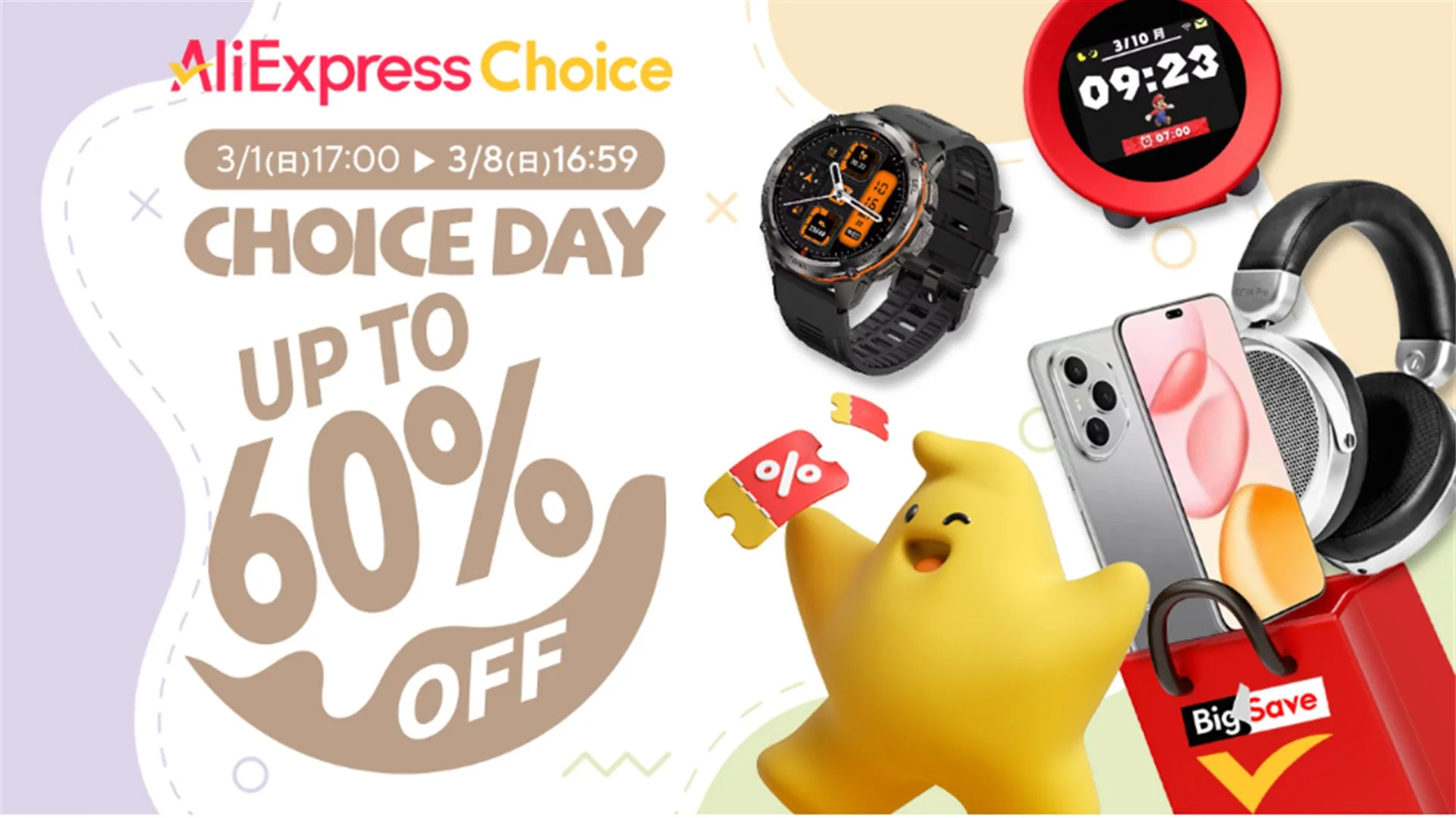 AliExpressにて、最大60%オフで最大55ドル=8800円オフのクーポンが使える、「AliExpress ChoiceDayセール」が3月1日よりスタートします。