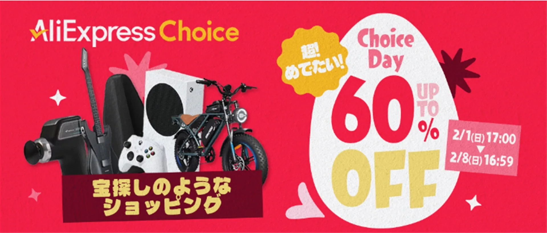 AliExpressにて、最大60%オフで最大60ドル=9400円オフのクーポンが使える「AliExpress ChoiceDayセール」がスタートします。
