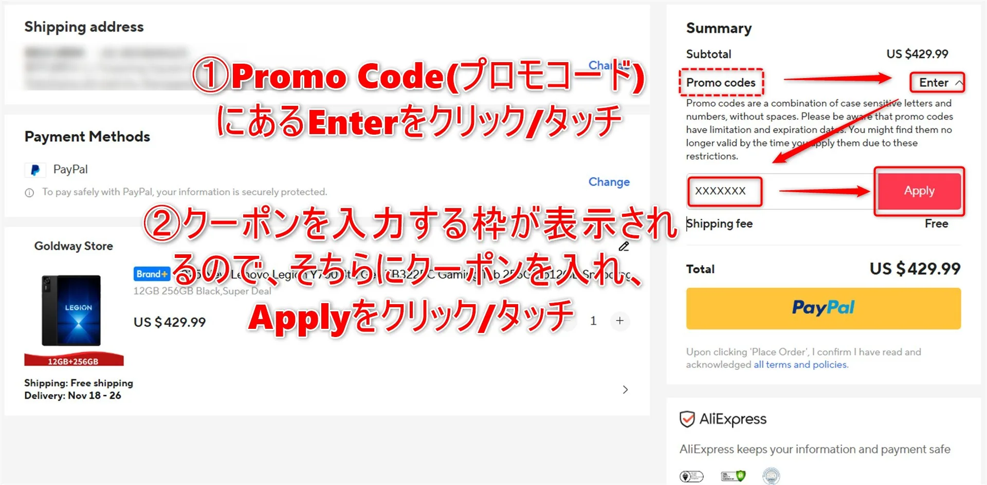 その下にクーポン枠が表示されるので、クーポンを入力して「Apply(申し込む)」をタッチ/クリックすればOK。