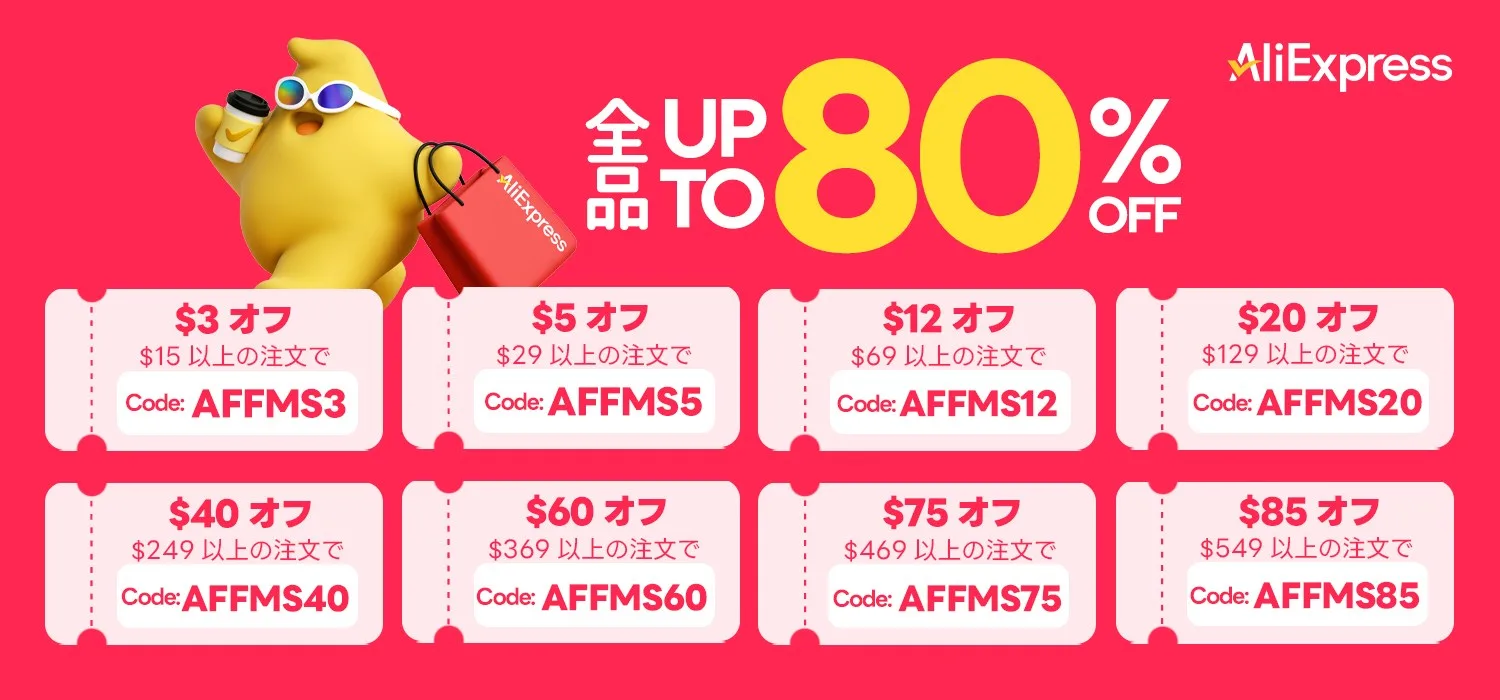 以下3ドル~120ドルの値引きクーポンの一覧です。AFFから始まるのがグローバルクーポン、JP/SMと付いているのは日本専用のクーポンです。どちらを使ってもOK。