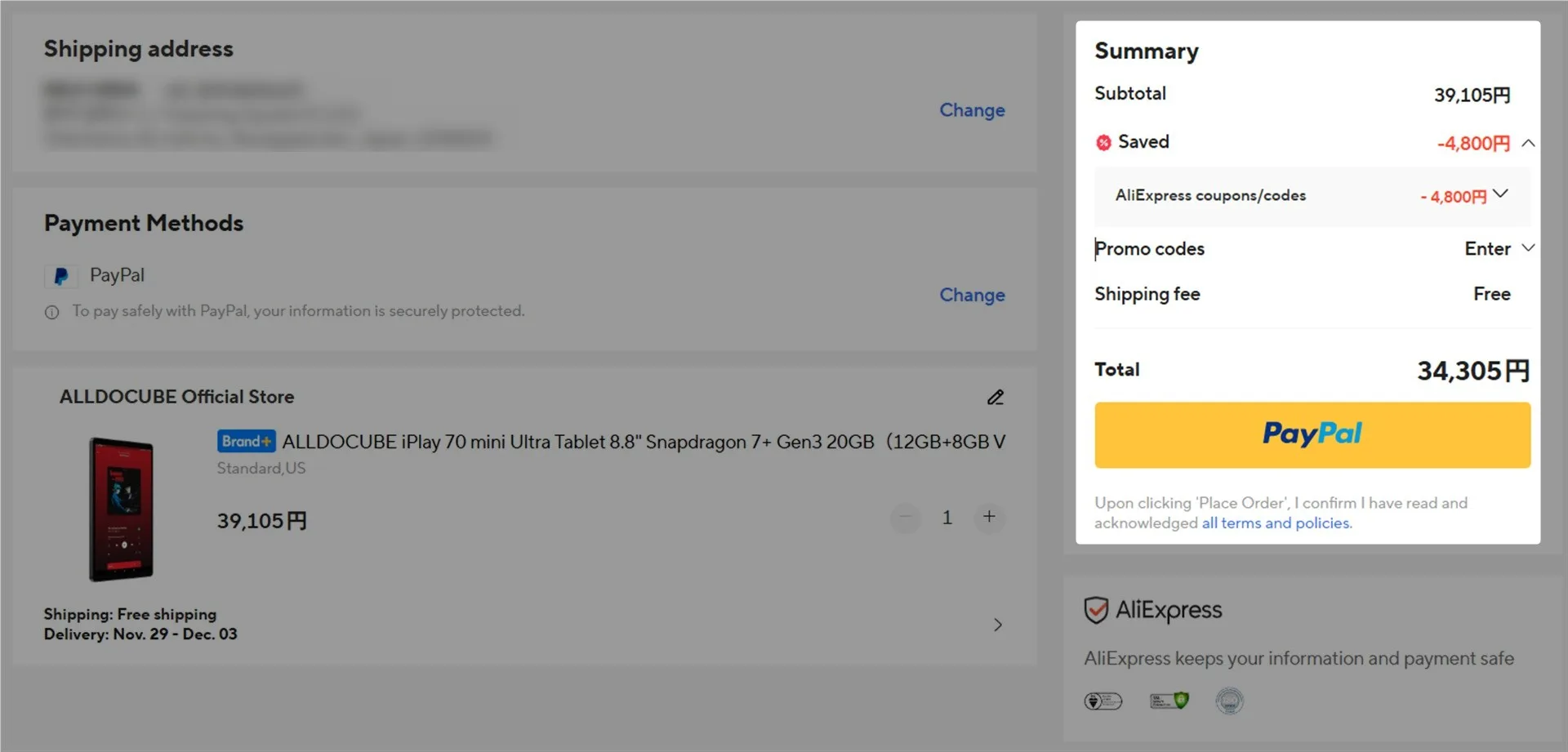 クーポンで37,999円となりますが、それでもAliExpressが4000円ほど安く買えます。