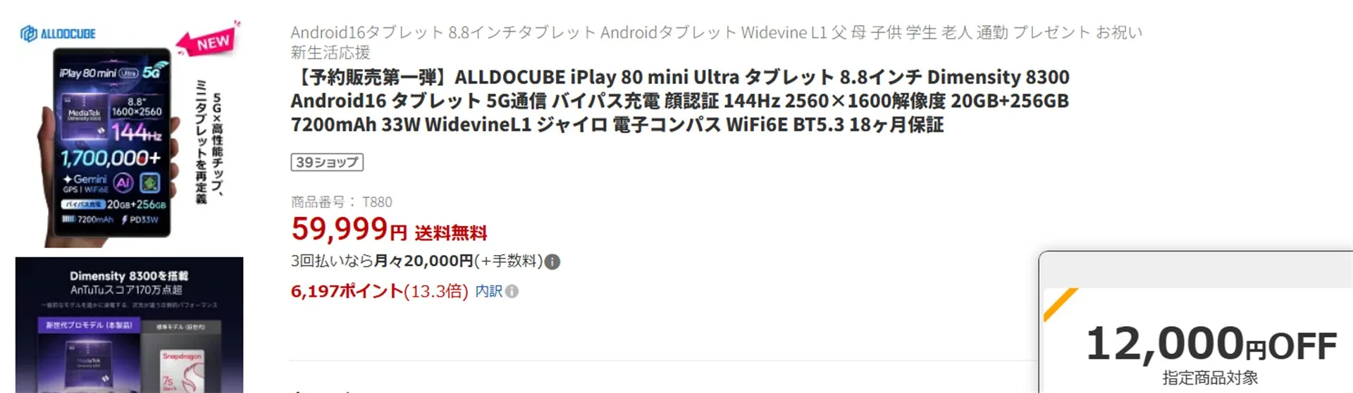 iPlay 80 mini Ultraは、楽天市場で59,999円で発売開始。