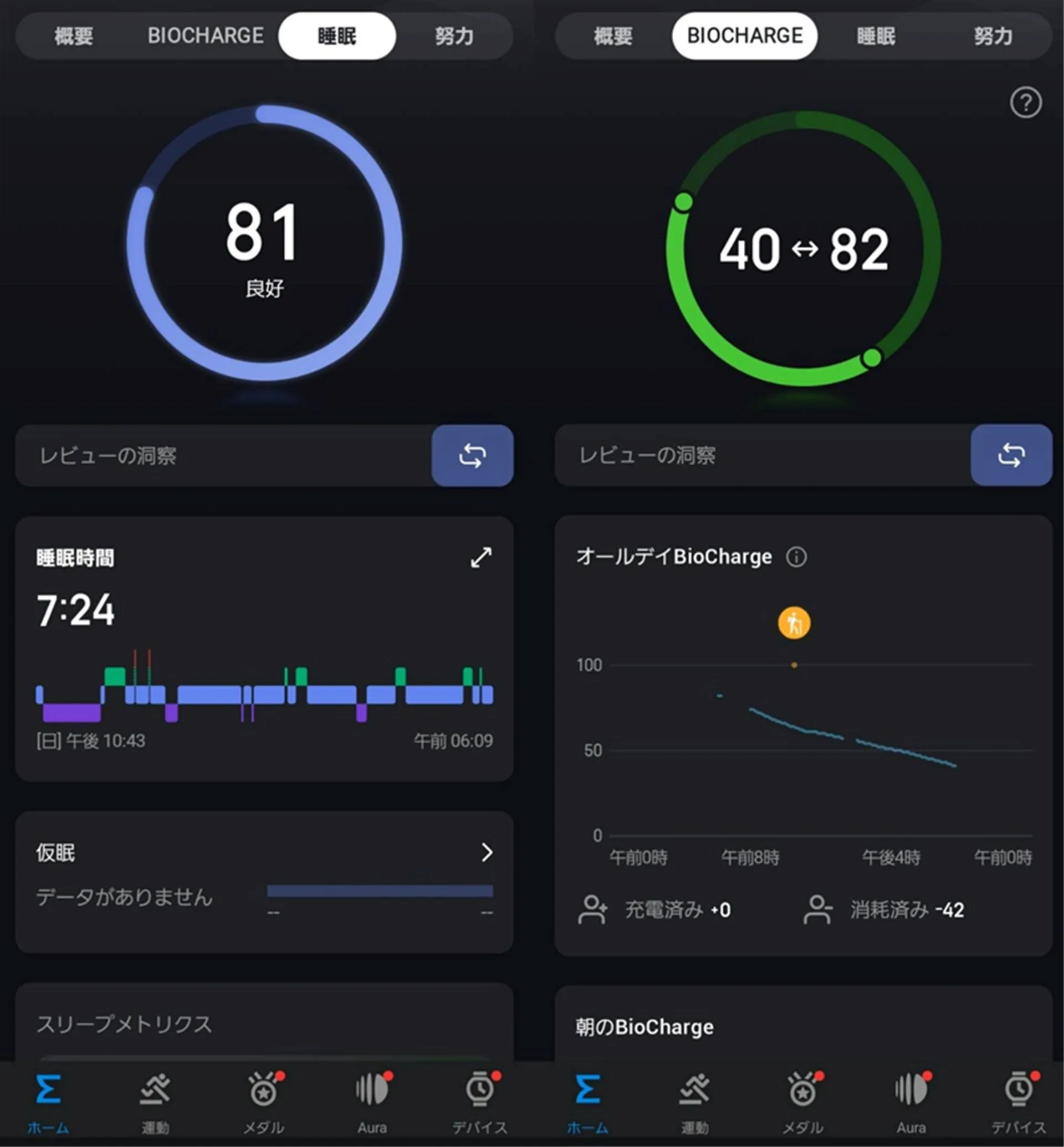 また睡眠や運動といったデータを総合的にポイント化して表示してくれる「BioCharge」というデータもあります。