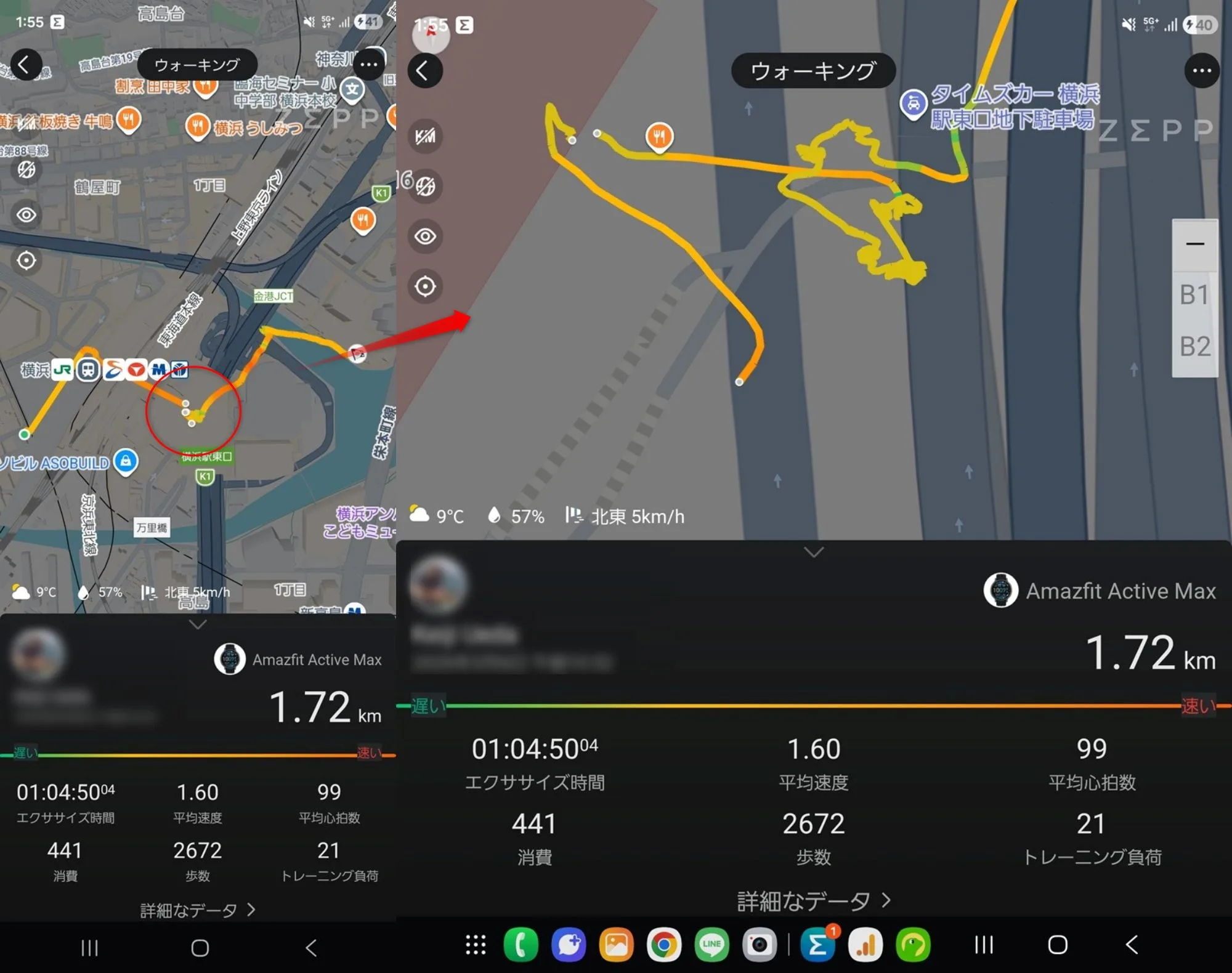 GPSの測位も細かくルートを追え、上記横浜駅でぷらぷらしたものですが、あえてぐにぐに歩いてみてもしっかりと軌跡として残っています。