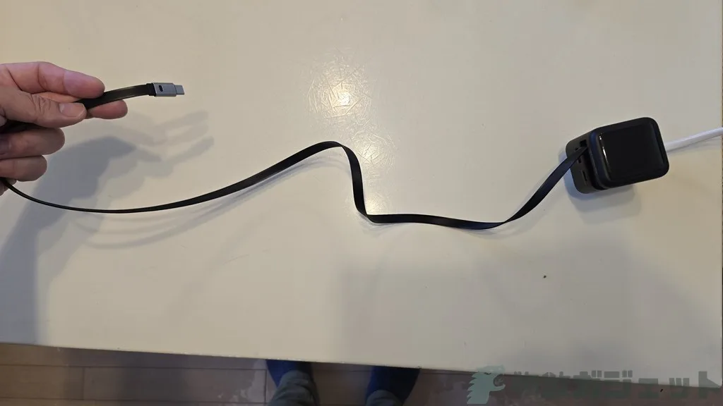 内蔵のUSB Type-Cケーブルは78cmと非常に長く引き出せます。これなら取り回しがキツいビジネスホテル等でもPC充電できるぐらいの長さはありますね。以前私は60cmの充電器も使った事があるのですが、60cmではややキツいホテルもありましたので、78cmはかなり助かるはずです。