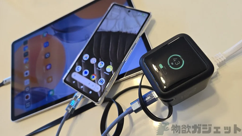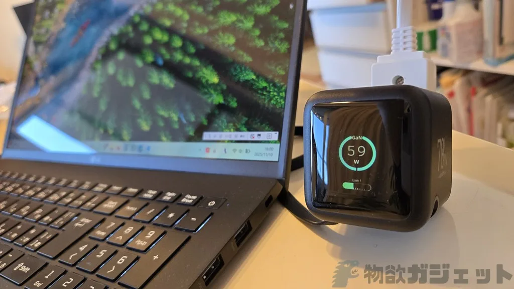 またもう一台スマホが充電できるのも利点で、私のPCは基本65W、でも45WでもOKというタイプなので、45W+25Wで充電できるこの充電器は重宝します。そしていま何ワット充電しているかも見えるので、複数台充電の場合は限りある電力の割合が一発で見えて、分かりやすくて助かります。