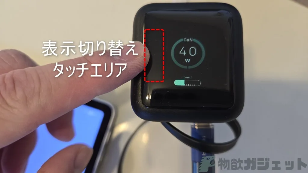 但しディスプレイが付いている分、ケーブル/コネクタは下となるため、コンセントに挿しつつケーブルを充電器側に繋げるのは少し面倒。コネクタを上にすれば挿しやすくなるがディスプレイ表示が逆さまにはなる。
