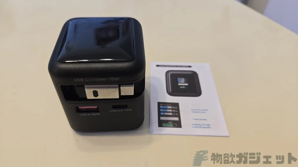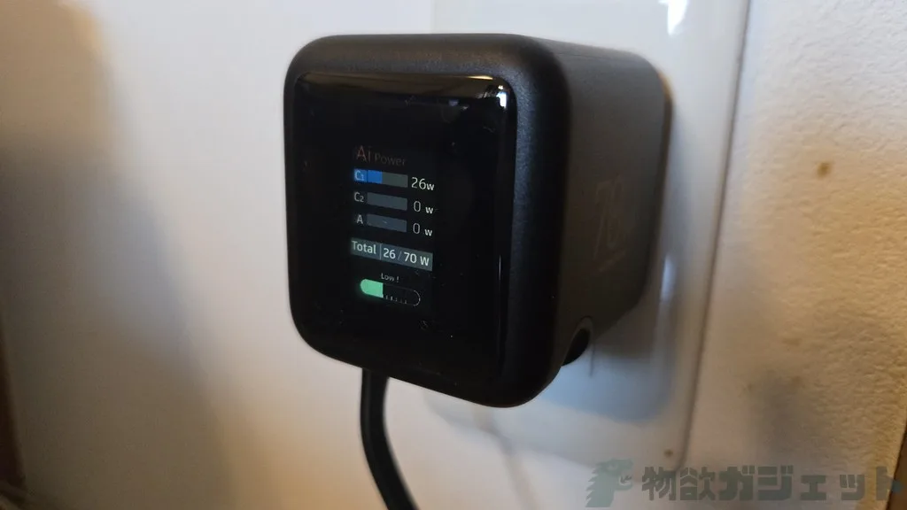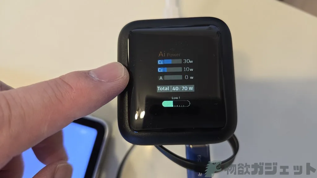 また特徴的なのがディスプレイを搭載している点で、各ポートで何ワットで充電しているか分かるので、3ポート使っていてもどのポートが低速充電か、高速にしたければ抜いたほうがいいかなどの判断ができるのが魅力です。