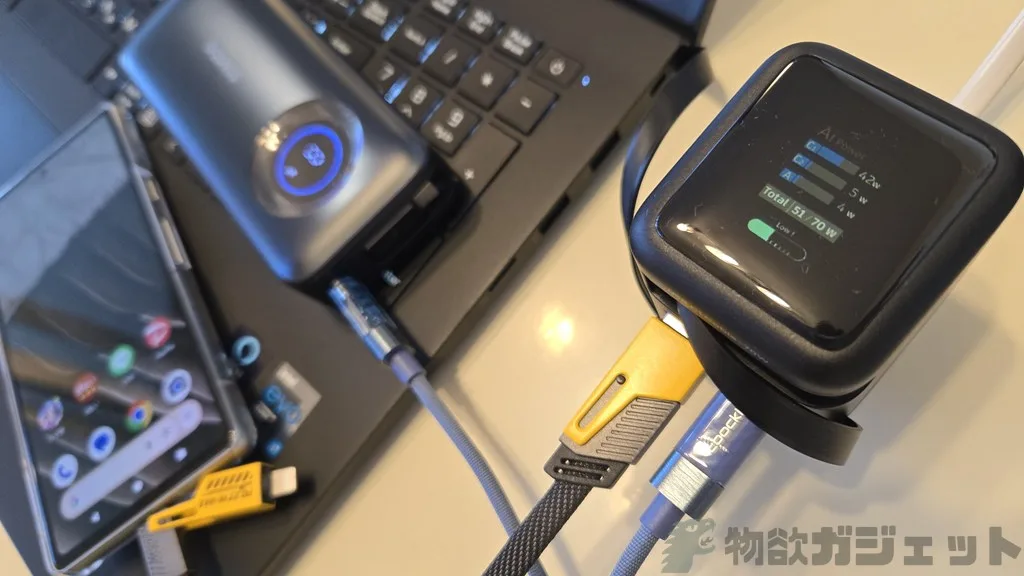ASOMETECH 70W 充電器CH055-PQは、性能的にも最大70W充電とノートPC充電が可能で、更に内蔵USB Type-Cケーブル+USB Type-C+USB Type-Aの3ポート充電まで可能。