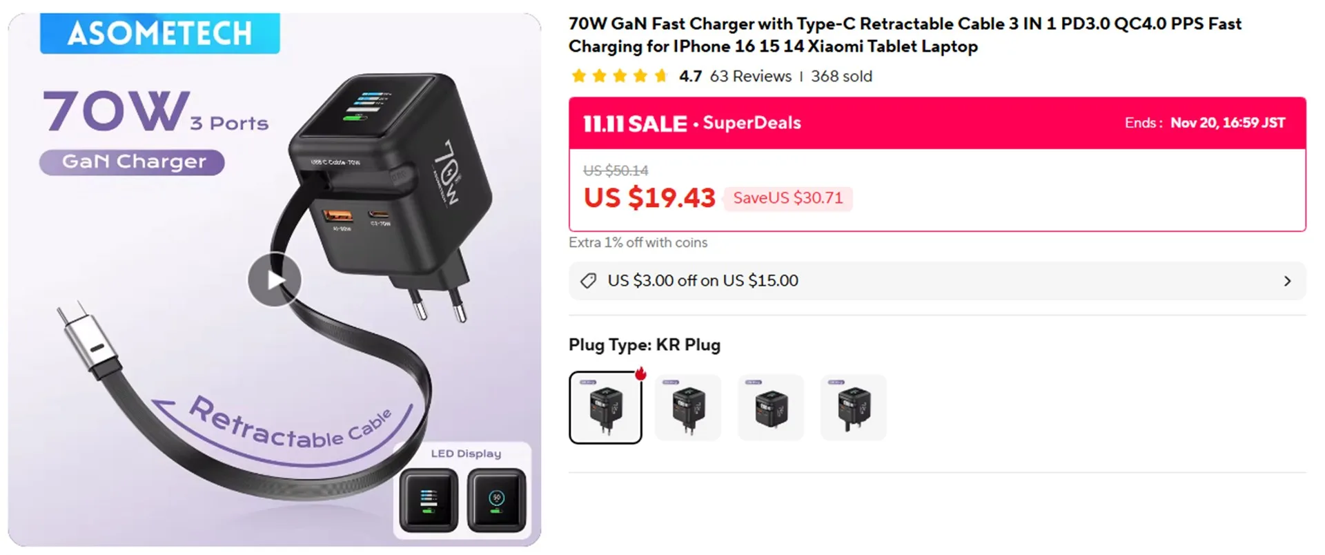 ASOMETECH 70W 充電器CH055-PQは、19.43ドル(約3000円)となっています。