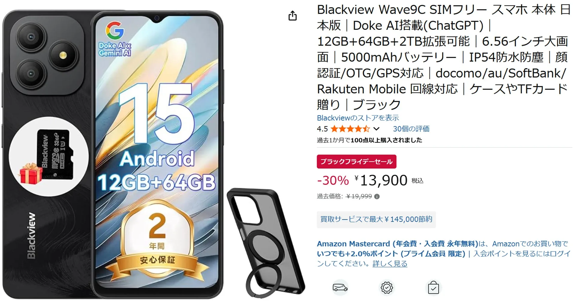 Blackview WAVE8は、通常19,999円ですが、BlackviewのAmazonのブラックフライデーセールにて13,900円で販売中です。専用ケースとmicroSDカード32GBが無料で付いてきます。