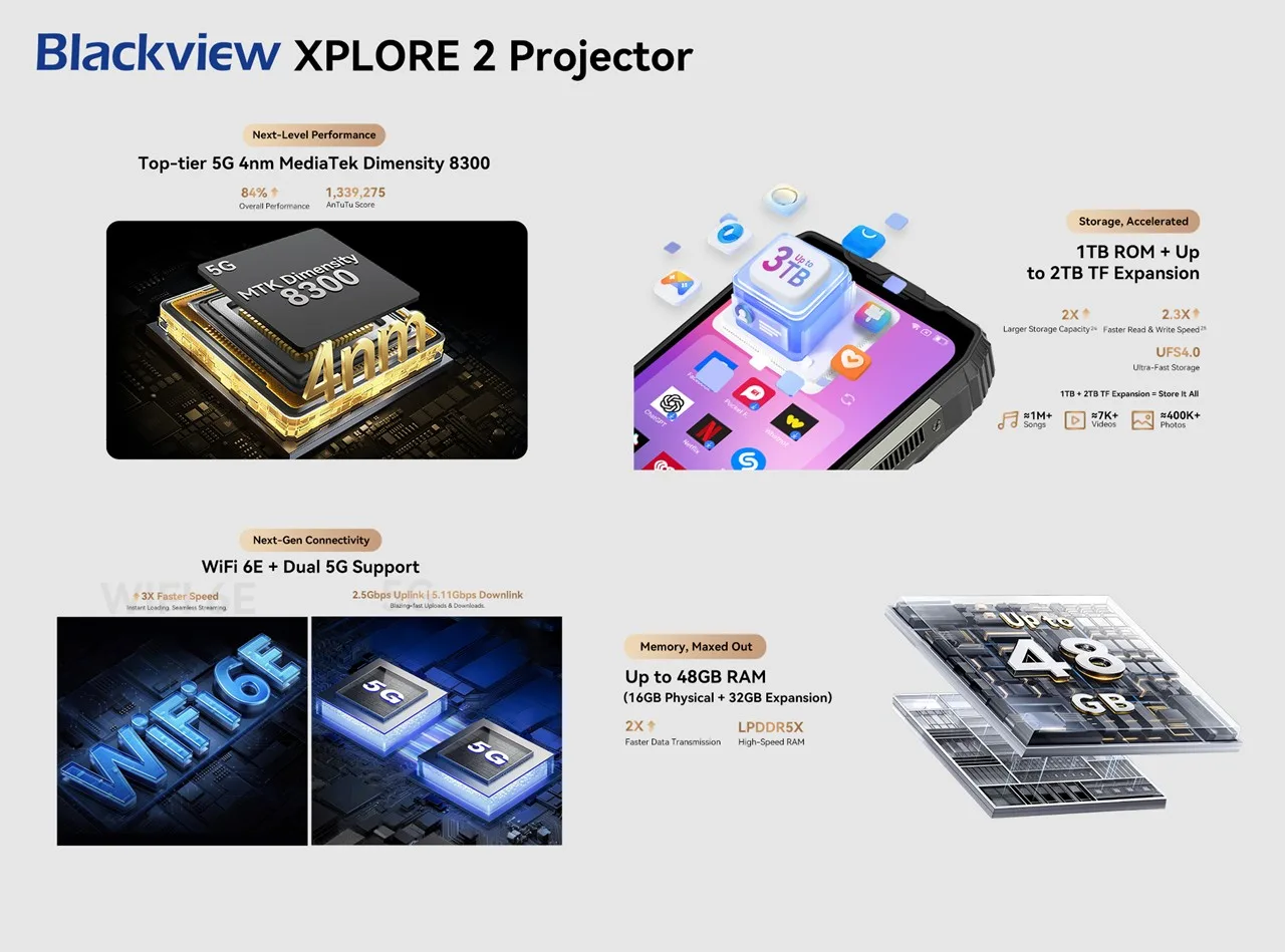 5G 4nm MediaTek Dimensity 8300チップセットをパワーアップしたXPLORE 2シリーズは、3.35GHzのピーク周波数とAnTuTuスコア133万超を実現。48GB LPDDR5X RAM(物理16GB+32GB RAM拡張)と1TB UFS4.0 ROM(最大2TBまで増設可能)を搭載し、スムーズなマルチタスクと高速データアクセスを実現。WiFi 6EとデュアルSIMデュアル5Gによりシームレスな接続性を確実にします。