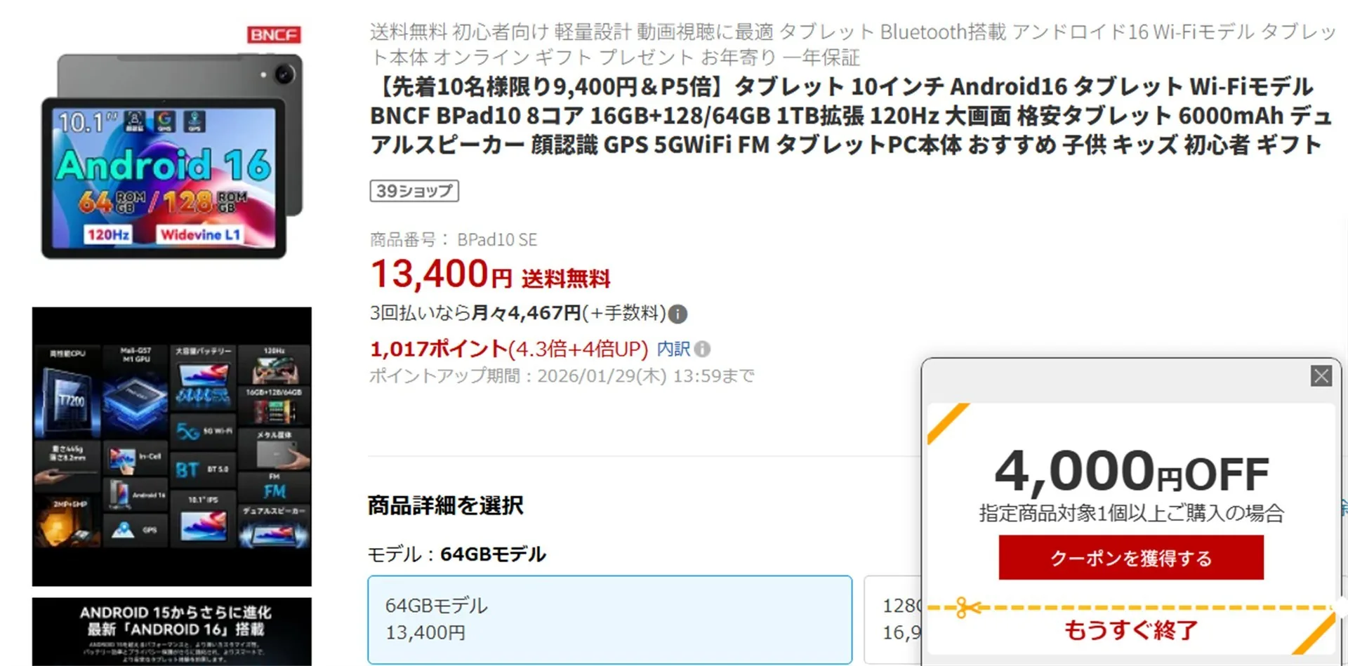 但し、4000円オフクーポンがあり値引き後価格はなんと”9400円”と1万円切り。
