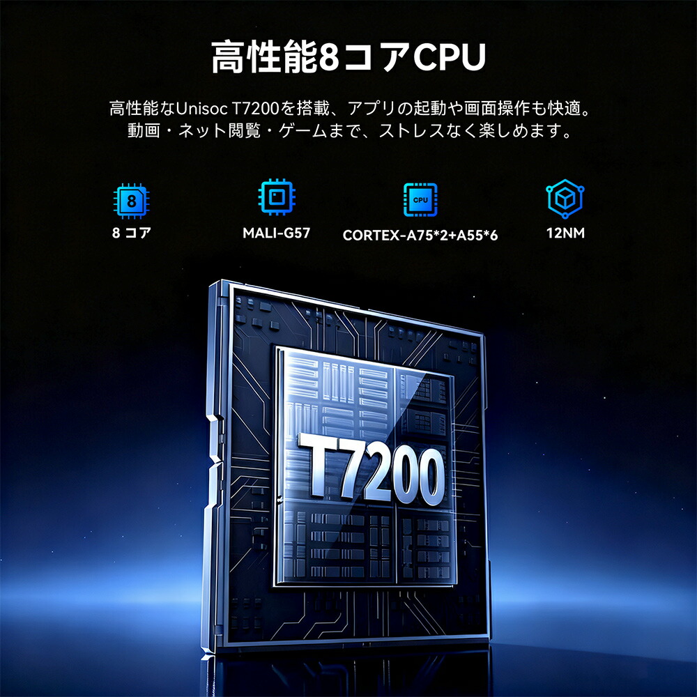 | プロセッサ (SoC) | Unisoc T7200 オクタコア (実質Unisoc T606相当)1.6GHz x 8 |