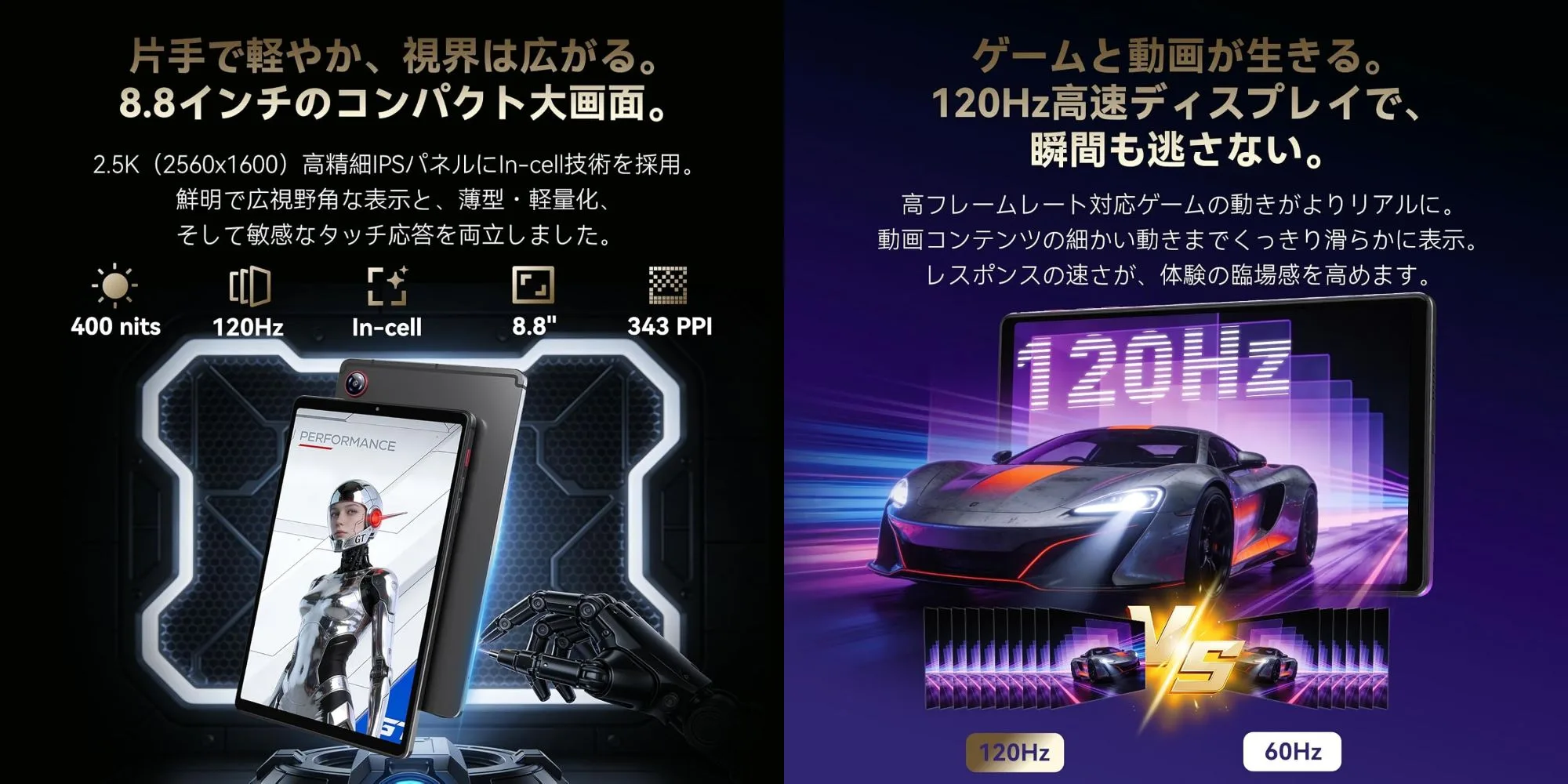 | ディスプレイ | 8.8インチ 液晶 (2560×1600) リフレッシュレート:120Hz 輝度:400nits |