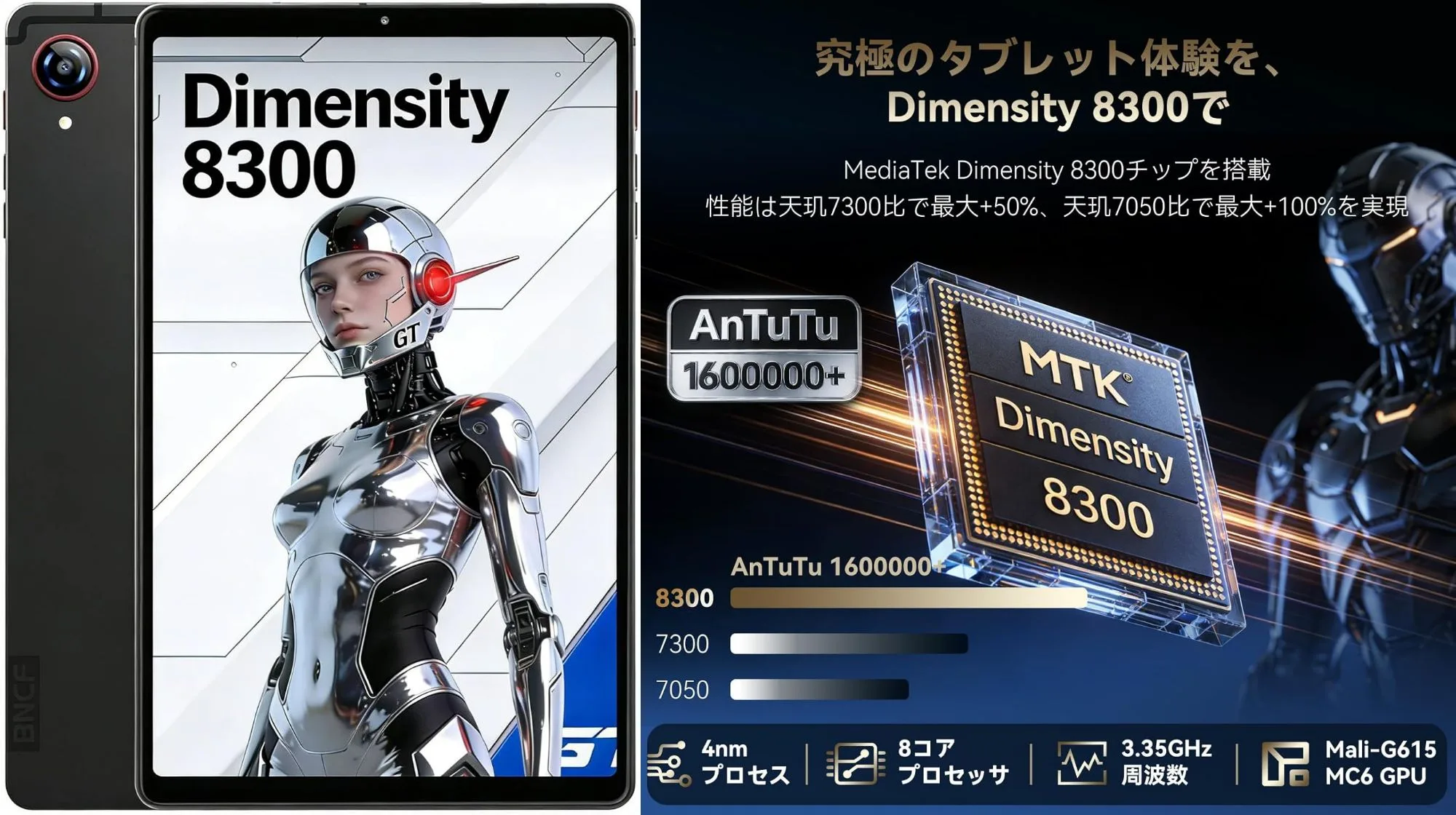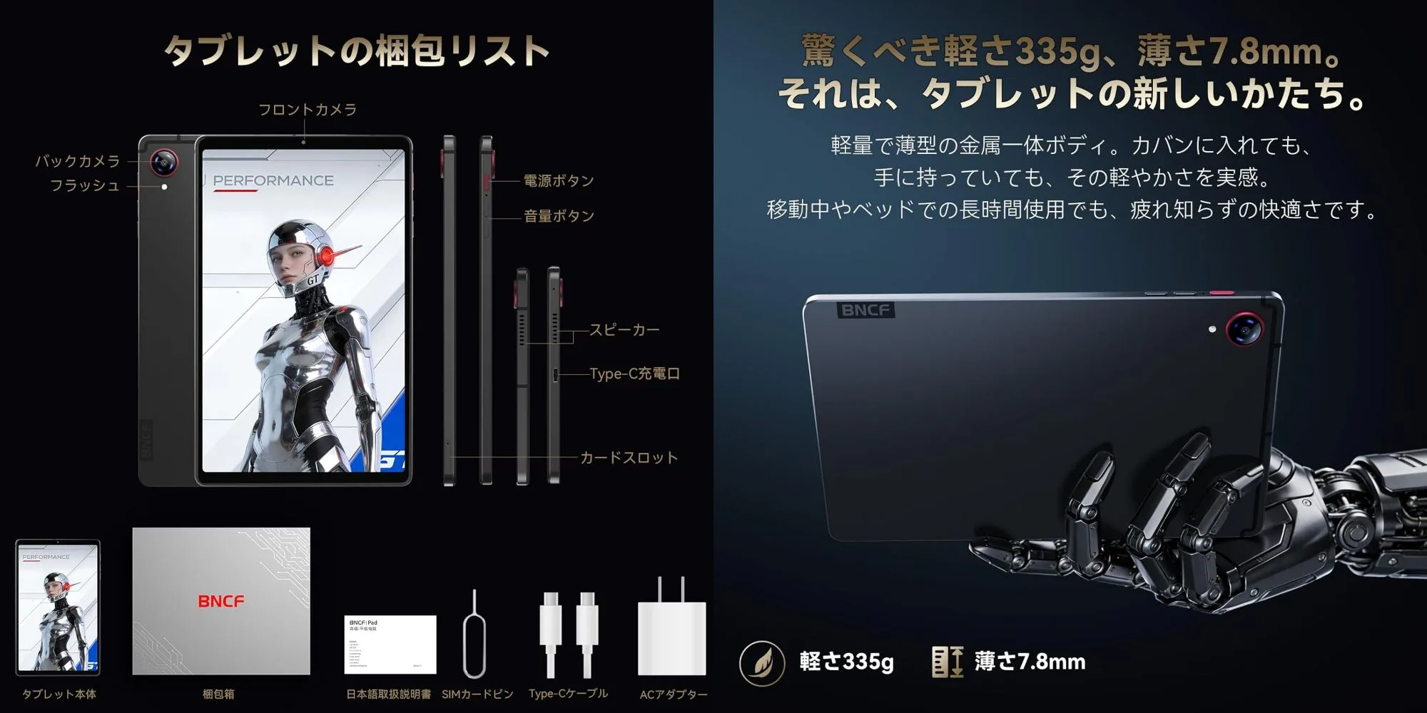 コスパの良い低価格タブレットを発売しているBNCFから、Dimensity8400を搭載しAnTuTu 160万点と謳う 8.8インチタブレット「BNCF BPad GT」が発売されました。