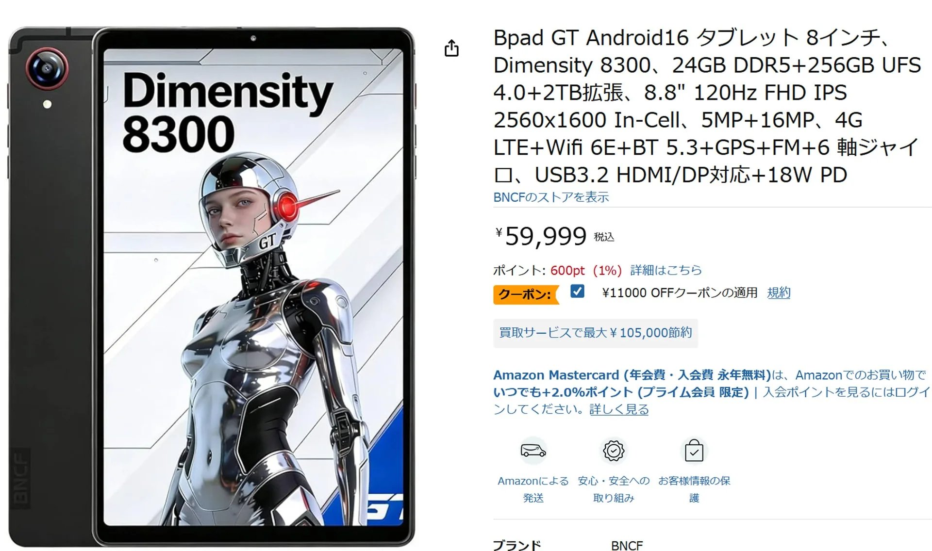 BNCF BPad GTは、Amazonで発売中。価格は59,999円ですが、11,000円オフクーポンがあり、48,999円です。