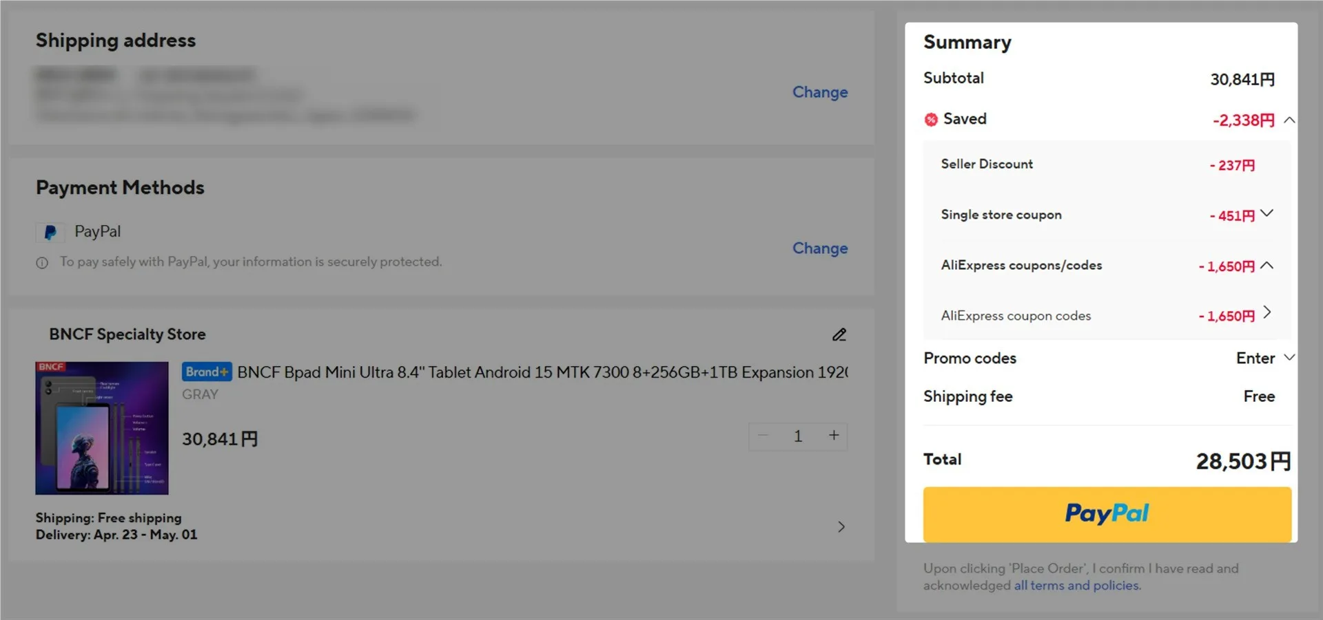 但し、以下2つのクーポン適用で、2338円の割引が使えます。日本円で約28000円です。