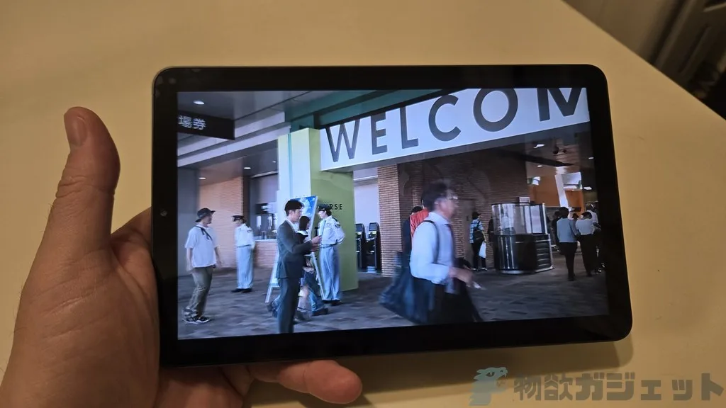 8インチクラスのタブレットでは、片側に2つ揃えるタイプのあるのですが、左右1個ずつのこの配置は動画視聴用としても理想的です。