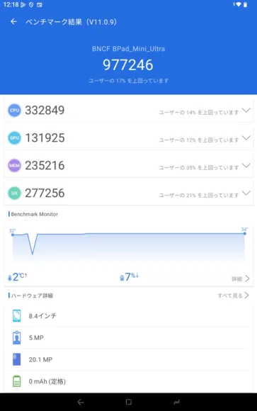 これまでの8インチクラスはHelio G99(AnTuTu約40万点)が主流でしたが、BNCF Bpad Mini Ultraはその2倍以上のスコアを叩き出しつつ、価格を据え置いた驚異的なハイコスパ機です。