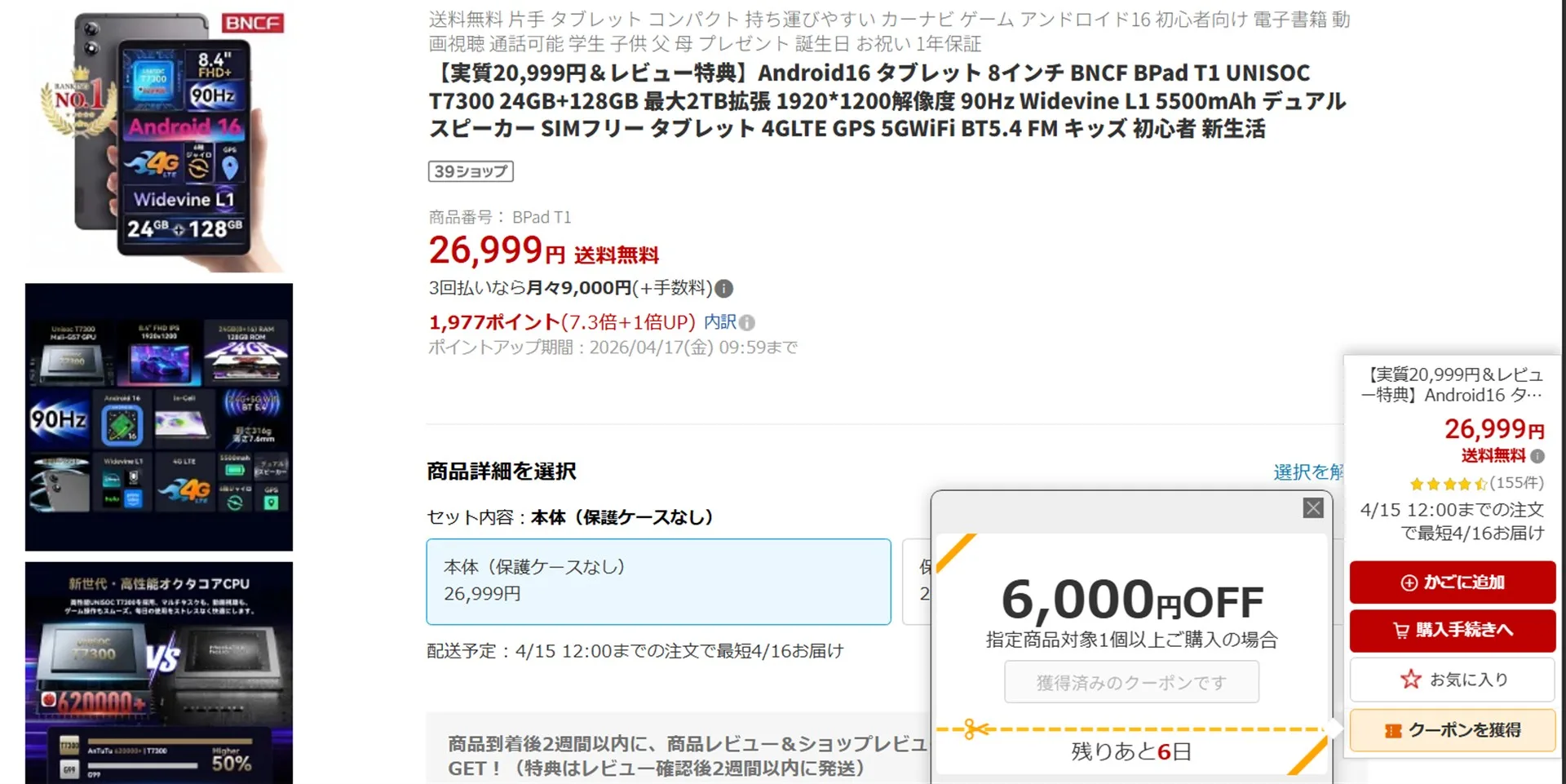 BNCF BPad T1 は、26,999円で楽天市場公式ストアにてセール中。