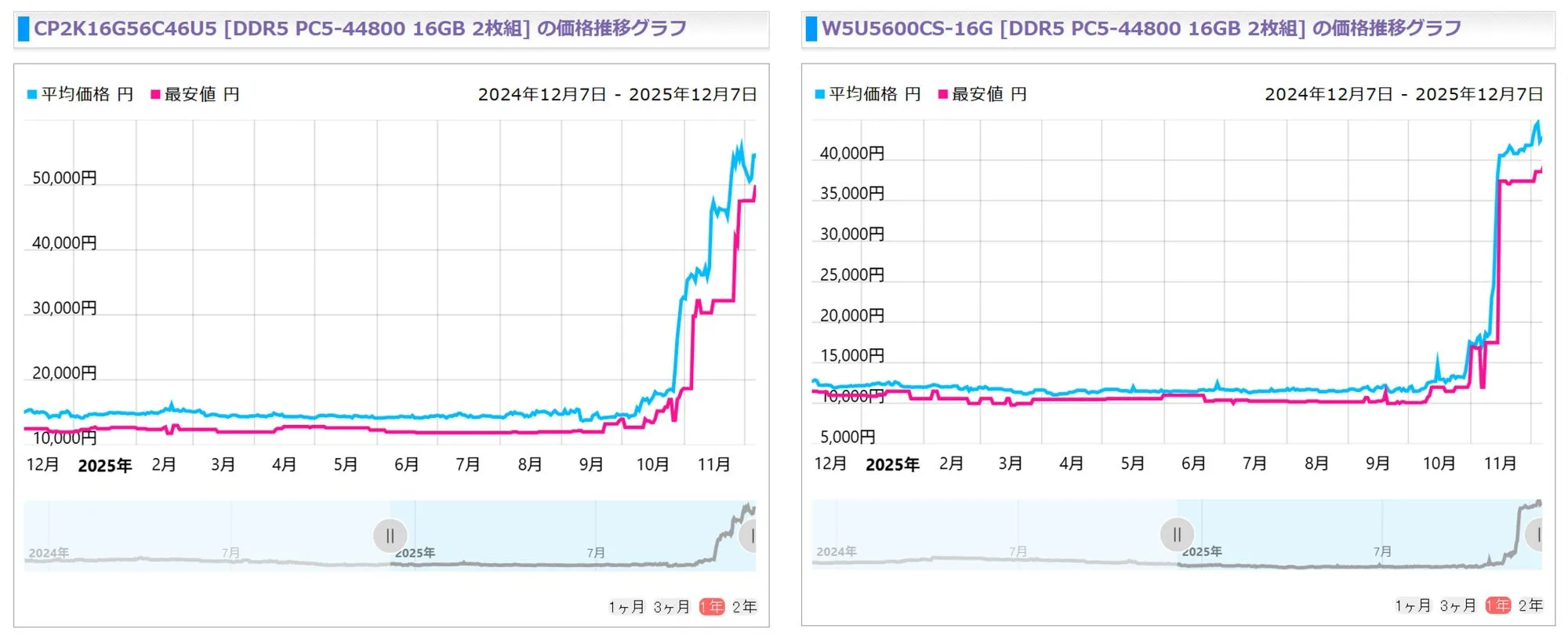 Crucialに至っては、それ以前が12,000円程度であったのに対して、現在が5万円と4倍以上です。