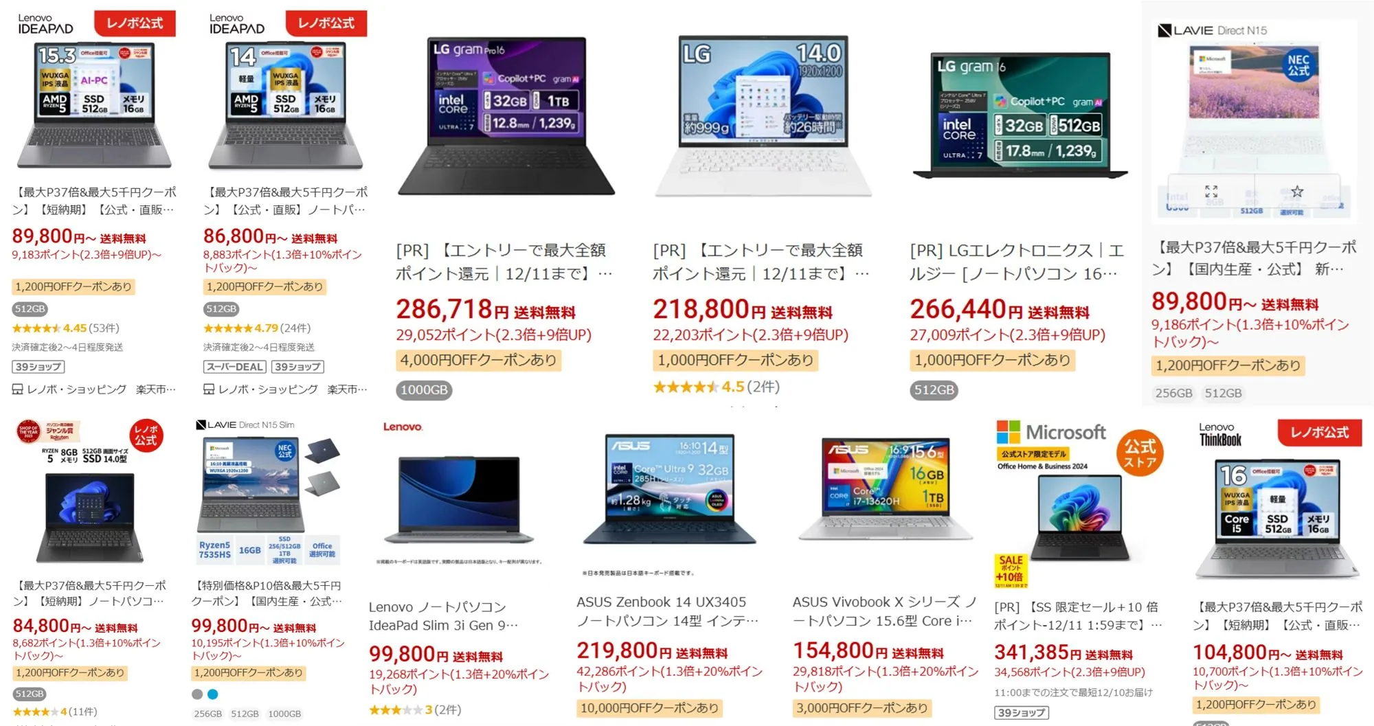 LGだけでなく、Lenovo、NEC、マイクロソフト(Surface)、ASUS等の公式が+10%とか20%還元も実施しています。