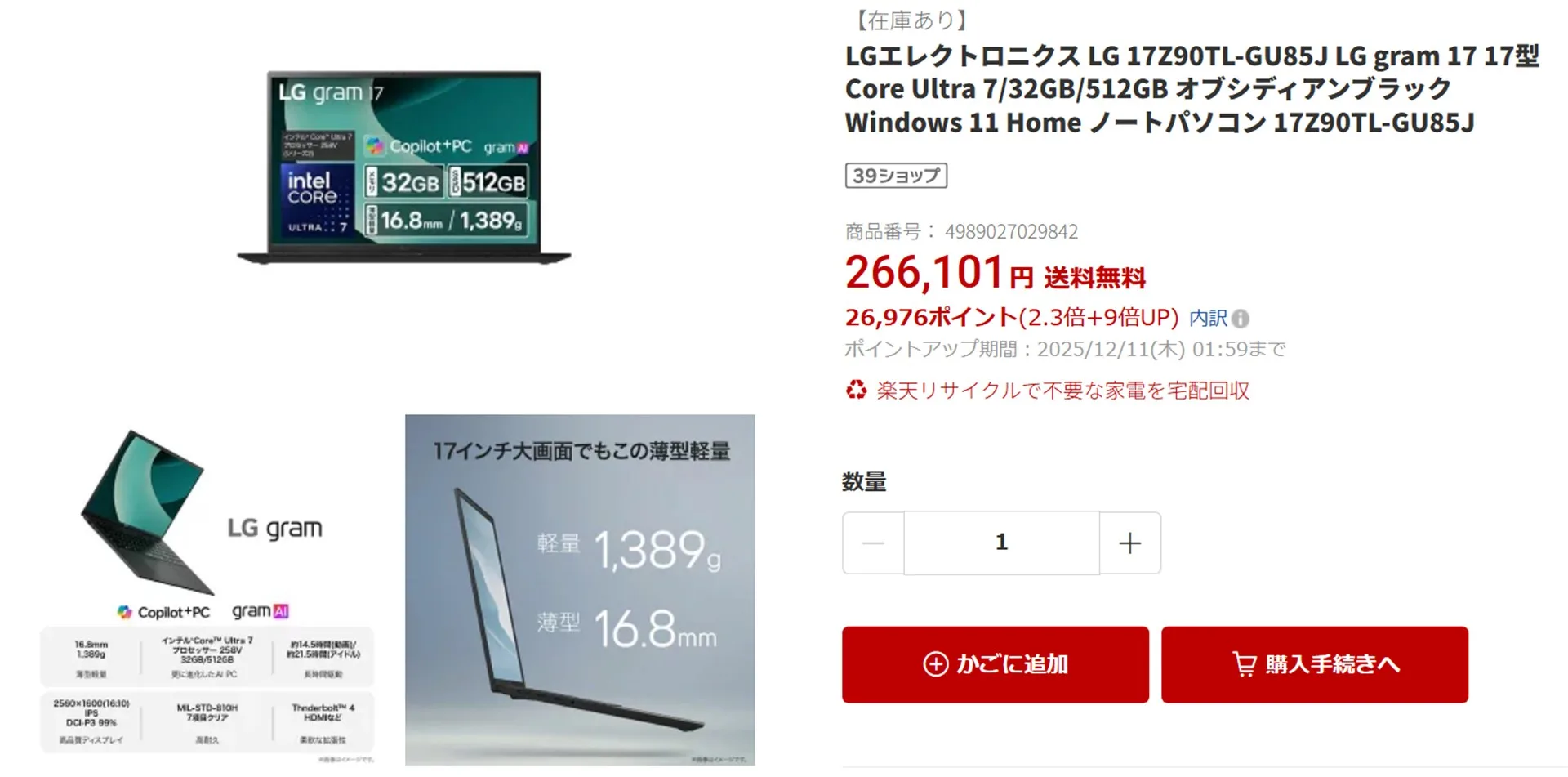 特にいまは、楽天スーパーSALEを開催中の為、ポイントが非常に高い+9倍とか10倍などがあり、この還元額も加味すれば、価格.comで安い店をさがすよりも圧倒的に安いです。ちなみに価格.comでは26万円ぐらいが最安値ですが、ポイント還元考えれば240,000円ぐらいになりますし、楽天スーパーSALEのその他ポイント還元キャンペーンも同時に有効の為、私の場合ポイント還元は更に数千円プラスされます。