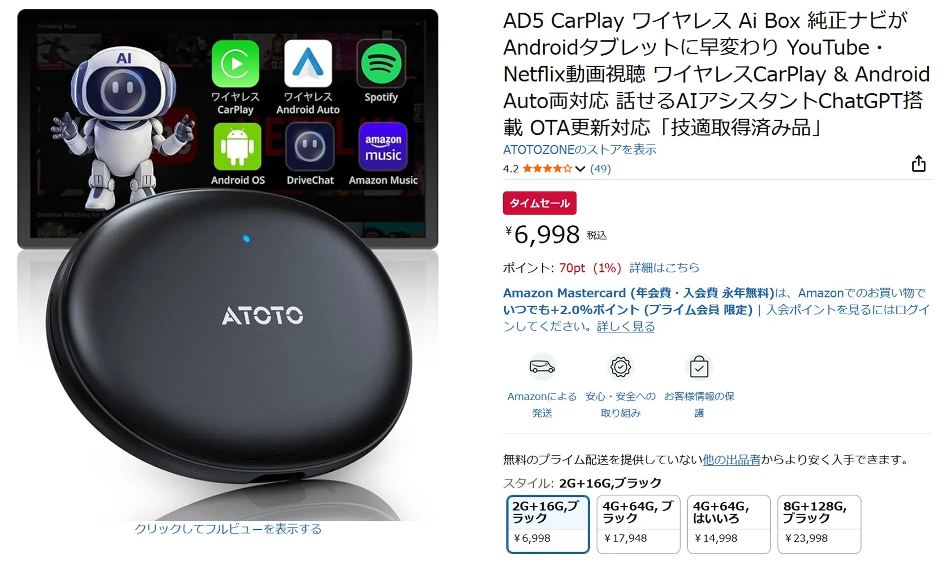 この「CarWave AD5A-BK」が、Amazonのタイムセールで、6,998円となっています。