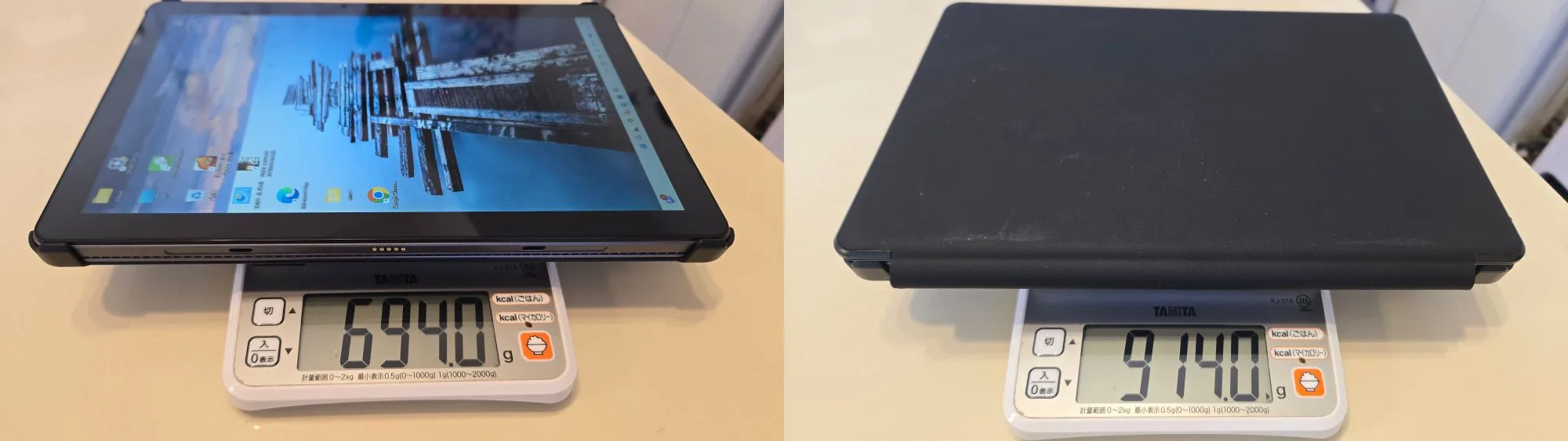 重量は、タブレット単体(カバー付)で694g。キーボードと組み併せても914gと1kgを余裕で切ります。
